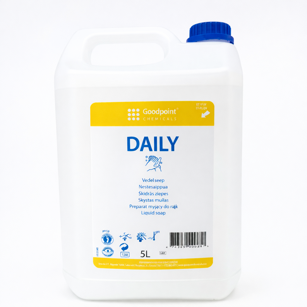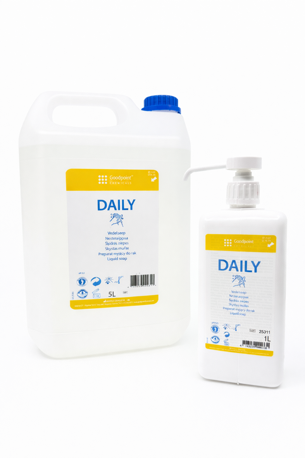 DAILY это мягкое жидкое мыло без запаха и цвет для мытья рук, всего тела и волос. Жидкое мыло содержит увлажняющие и смягчающие кожу, а также восстанавливающие липидный слой вещества, а также компоненты для защиты кожи, которые сохраняют ее естественный баланс влажности даже в глубоких слоях кожи, прочность коллагеновых связей, естественную мягкость кожи и нормальный уровень pH.